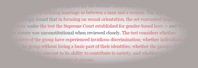 After all that, the model below still doesn’t define marriage, let alone gay marriage. It doesn’t try to. It doesn’t say gay marriage should be embraced. It doesn’t say gays are entitled to all the privileges and considerations of marriage. Its narrower argument is that, whatever gay marriage is, gays belong to a class of citizens entitled to special consideration to determine whether depriving them of the right to marry is unconstitutional.